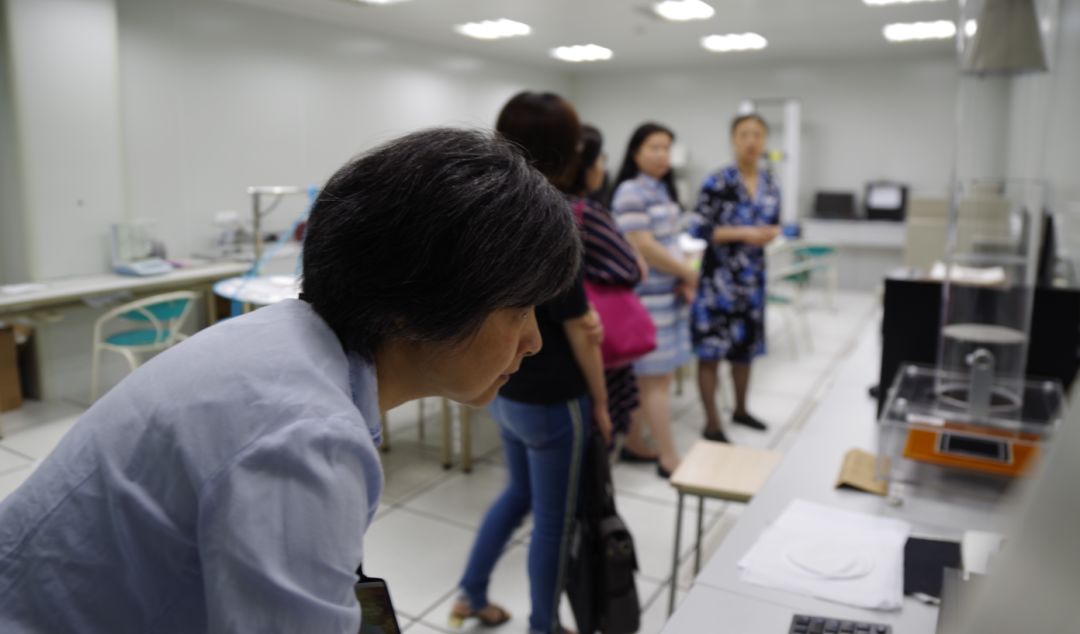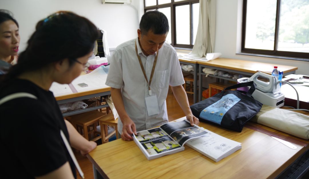 (欲漫涩 李俊院长向考查专家介绍服装缝纫工艺实验室)