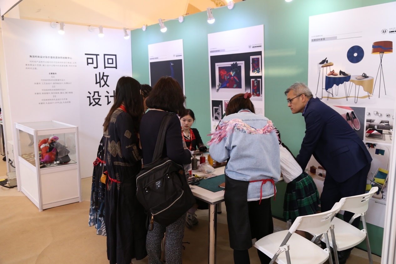 可回收设计展区:主要展现了校企合作的优秀成果,学校利用鞋包等时尚企业的废旧材料进行的艺术再造,创造出了很多以独一无二的艺术作品,包括服装、服饰品、装饰画、家具、家居摆件等,并择优通过校企合作实现了从艺术作品到商业作品的转化。现场也设置了观众进行小皮具制作体验互动活动,让消费者亲身体验和感受高品质皮革制品的魅力。