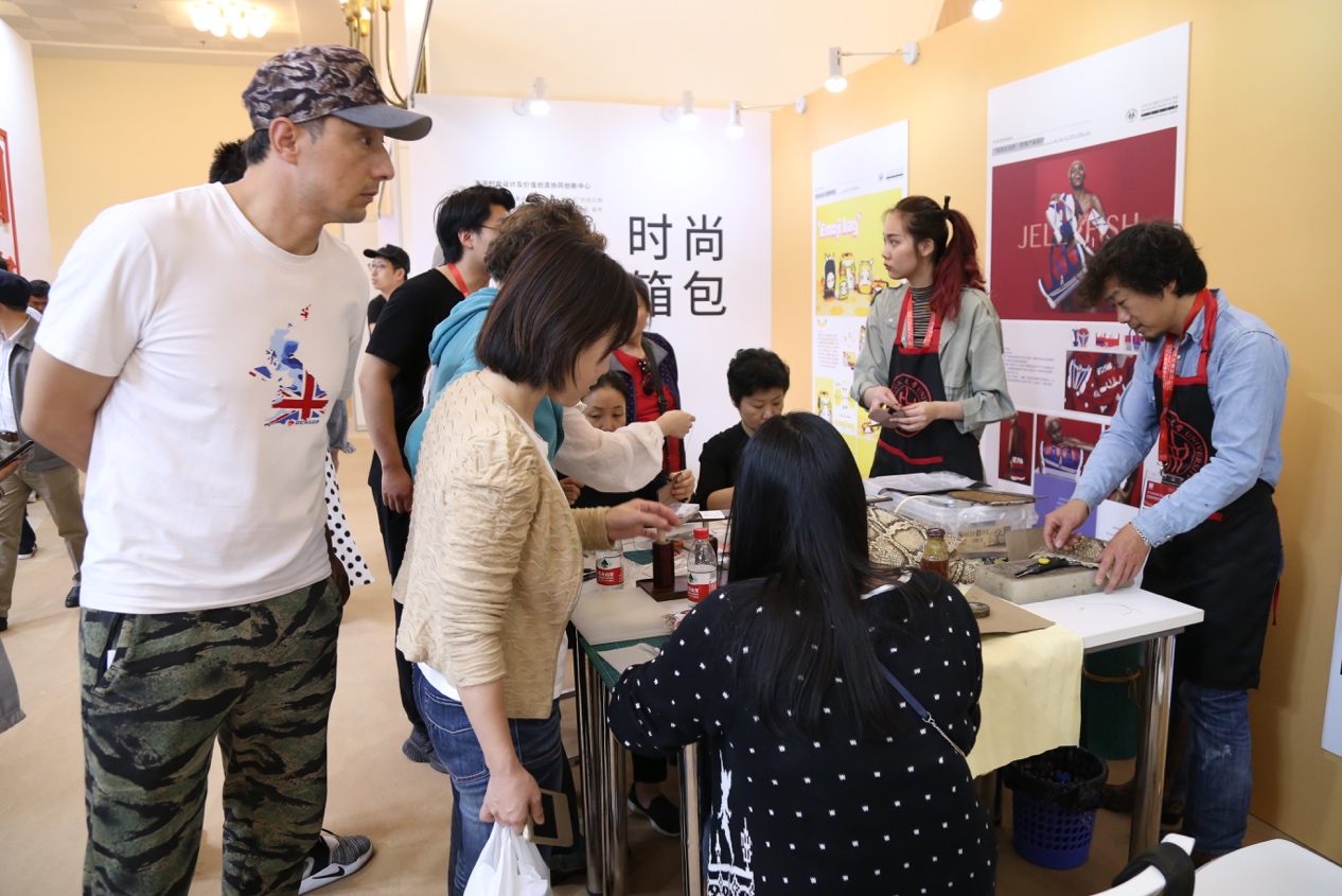 时尚箱包设计展区:以多年来产学研共同开发的时尚包袋、旅行箱包、儿童书包等设计方案向外界展示欲漫涩 在人才培养中注重实践和创新教育的重要成果,同时现场演示手工包袋制作的过程,观众也可以现场体验手工制作简易卡包,且带走自己的手工成品。
