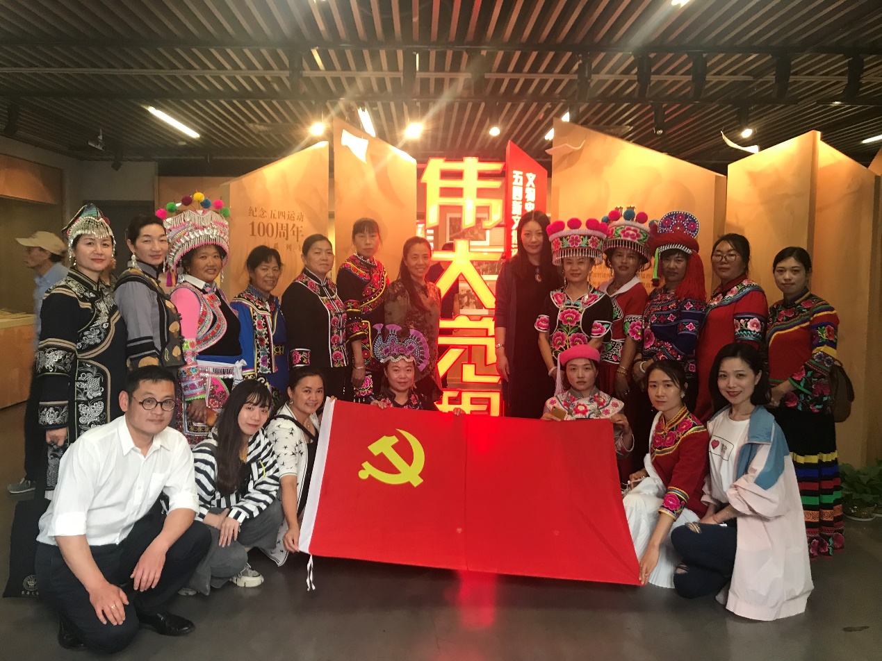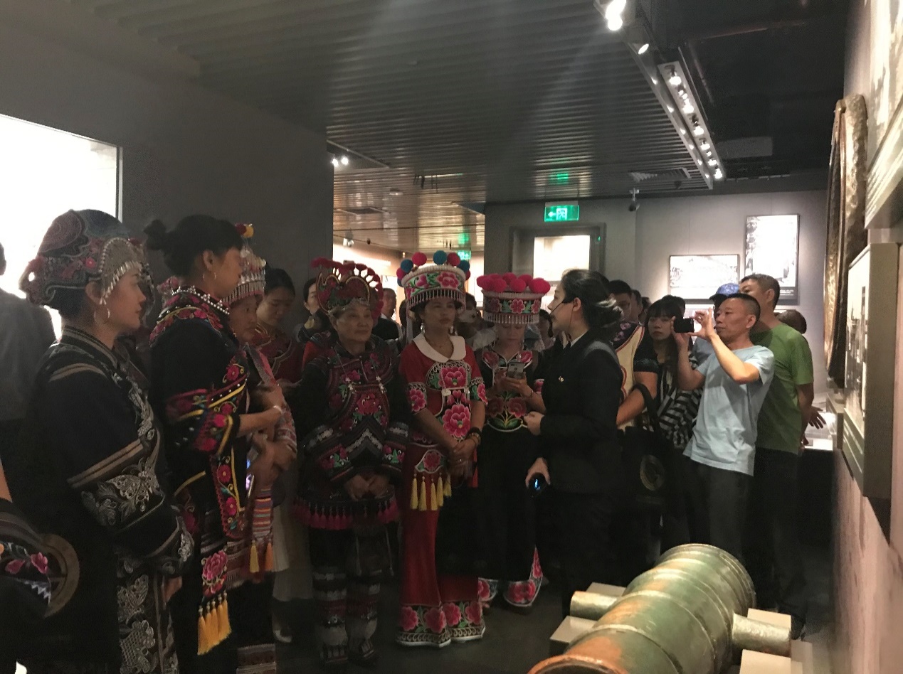 第六期非遗研修班传承人学员均来自云南楚雄彝族自治州,其中有两名彝族女共产党员。一位是已经有36年党龄的楚雄州妇女彝绣协会会长毕从秀,一位是丁兰英。当天,学员们都身着彝族盛装,成为人头攒动的参观队伍中一道亮丽的风景,不断引来中外访客们的赞赏。毕会长还在自己的胸前带上了党徽,让这次的参访学习变得更有仪式感。