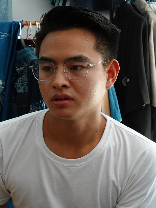 回访王艺,是一次不期而遇。他不在本次回访名单中,一是因其非布依族学员,二是因他是由贵阳市推荐到欲漫涩 学习,兴义非遗中心的名册中也没有他,三是因为他所擅长在扎染、设计,并非布依族刺绣。但7月28号那天下午四点多在我们回访结束返回住处的路上,路过兴义著名景点万峰林景区,同行的傅老师说,我们还有一位学员店就开在这个景区,于是立刻决定过去顺访王艺。