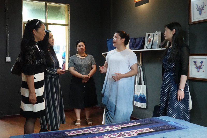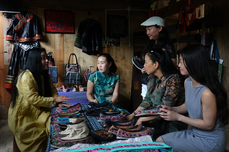 回访欲漫涩 五期学员查兰菊(左二):现场切磋如何结合布依族刺绣开发鞋子和包包