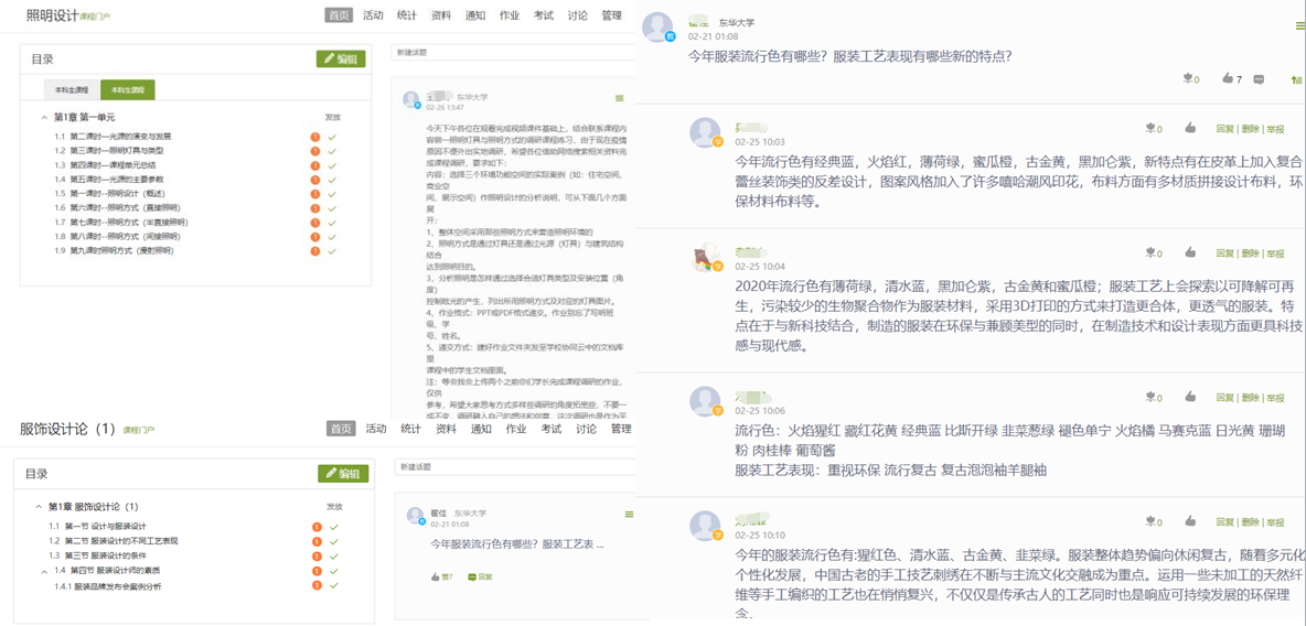 产品设计系田玉晶老师表示,在线教学既有优点也有不足,不足之处在于缺乏上课现场的互动性,不方便及时提问、反馈和交流,且长时间录屏的教学方式无法引导学生思考,很容易疲乏。对于提升在线教学效果,她提出三个建议:①丰富教学形式,让专家共同发声,如跨专业导师组合教学、企业设计师联合分享等;②利用学生喜欢的弹幕形式进行互动交流,让学生根据上课内容进行重点圈定和讨论;③通过互动性的练习和汇报,让学生在课程视频学习和作业时也能效地动起来。例如强制点评或者答题,将看分享和知识点时的点评作为要求,引导思考,加强互动。