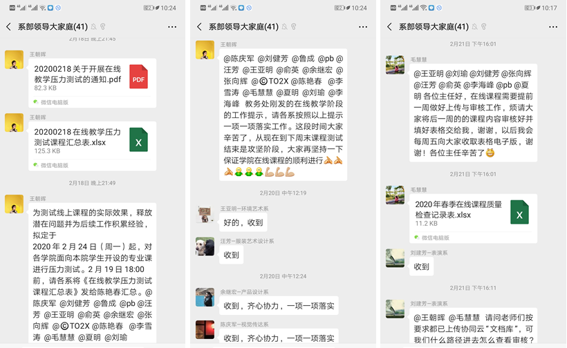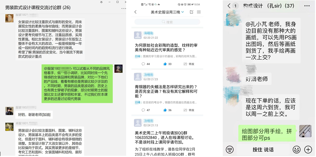 2月24日在线教学压力测试的第一天,网络拥堵、卡顿现象比较严重。针对在线课程中所反映的问题,老师们积极探索,形成了一套行之有效的办法。表演系刘建芳老师表示,利用手机学习通+课程微信群进行授课,学生提前看完课件PPT,上课专注认真,互动积极,第一次在线教学体验良好。美术学部孔超老师谈到,她所教授的《构成设计》是一门实践类课程,教师在充分把控课堂节奏之外,还应更直接、有针对性地参与到学生的实践创作中,通过“微信建群”的方式组织学生进行在线讨论、方案陈述、作品分享、作业点评,互动性、操作性更强,在网课教学中起到很好的辅助作用。服装设计与工程系召开教学研讨会,对如何有效进行课前准备、课堂管理、课后作业管理进行了全面总结,并将经验分享给全院老师。