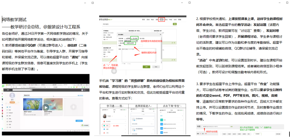 疫情期间服装设计与工程系召开了多次教学会议,对如何有效进行课前准备、课堂管理、课后作业管理进行讨论总结。例如: