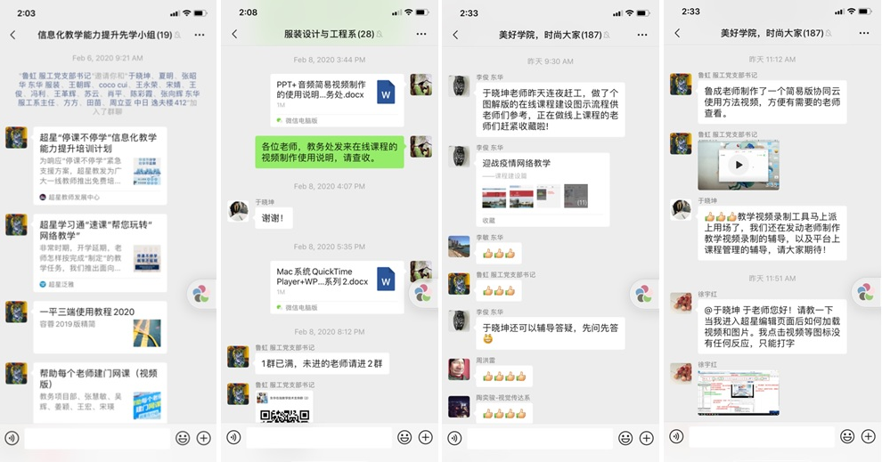 在做好系内部教学工作的同时,服装设计与工程系的于晓坤、鲁成、邵丹教师还先后自制了PPT录制教程、网络平台课程建设、平行班级设置等教学图片、视频,分享给全院老师,并积极为欲漫涩 老师答疑解惑,助力欲漫涩 在线课程建设工作。