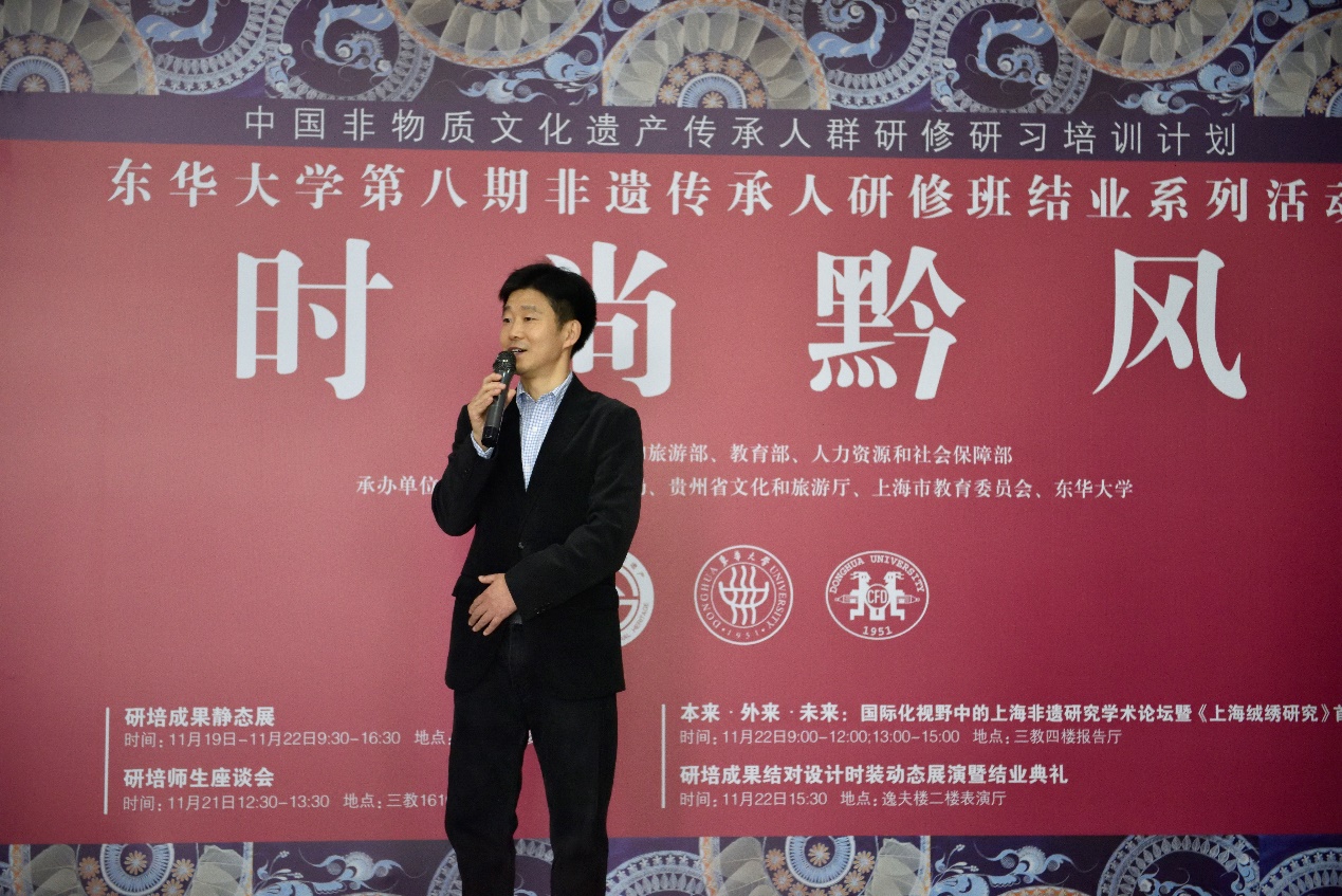 李俊院长在致辞中说,民族服装是服装领域的金山银山,在当今,只有从文化中挖掘传统基因与元素才能有助于时尚设计走向国际。传承人们将她们的民族记忆与民族文化带到学校里,对学校的学生而言也是一次珍贵的近距离与绣艺大师合作的机会。他表示,这期研修班的作品有许多惊喜,数量和质量超出了以往历期。