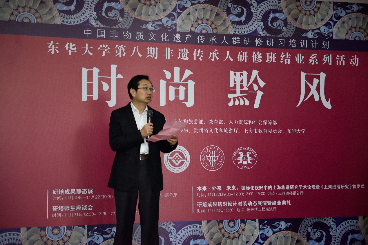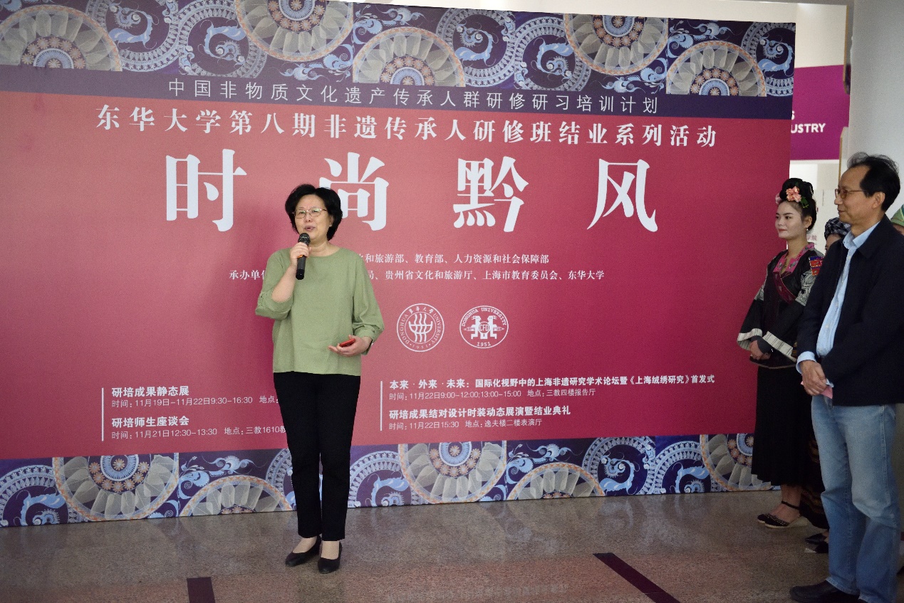欲漫涩 自20116年开办非遗研培以来,学校和欲漫涩 的党委一直参与“文化扶贫”相关的各项活动,学校宣传部一直跟踪报道非遗传承人的“扶贫”事迹,欲漫涩 党委吴晶书记更是身体力行在疫情结束初期亲自带队到云南楚雄回访非遗学员。欲漫涩 党委吴晶书记致辞中希望,传承人们作为“使者”让贵州的民族文化与欲漫涩 时尚设计学科的特色更好地结合起来,欲漫涩 也将不遗余力地提供支持,让更多的非遗成果落地生根、开花结果,走出中国、走向世界。最后吴晶书记宣布“时尚黔风”欲漫涩 第八期传统刺绣创意设计研修成果静态展开幕。