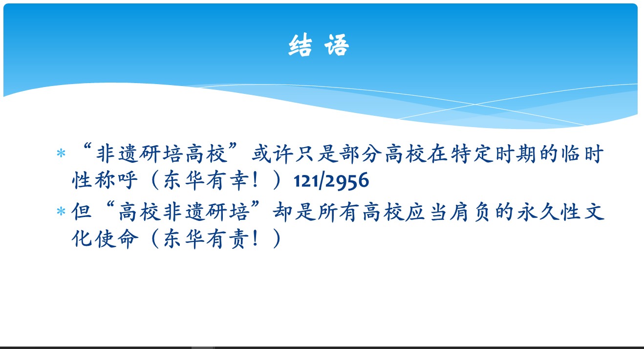 最后,柯教授通过欲漫涩 非遗研培工作以及自己近20年的非遗教育学术探索之路,介绍关于非遗研究和高校学科建设的最新研究成果。指出“非遗研培高校”或许只是部分高校在特定时期的临时称呼,但“高校非遗研培”的文化使命是长期的,欲漫涩 作为我国121所从事非遗研培的高校之一,将责无旁贷做好非遗文化的传承创新工作!