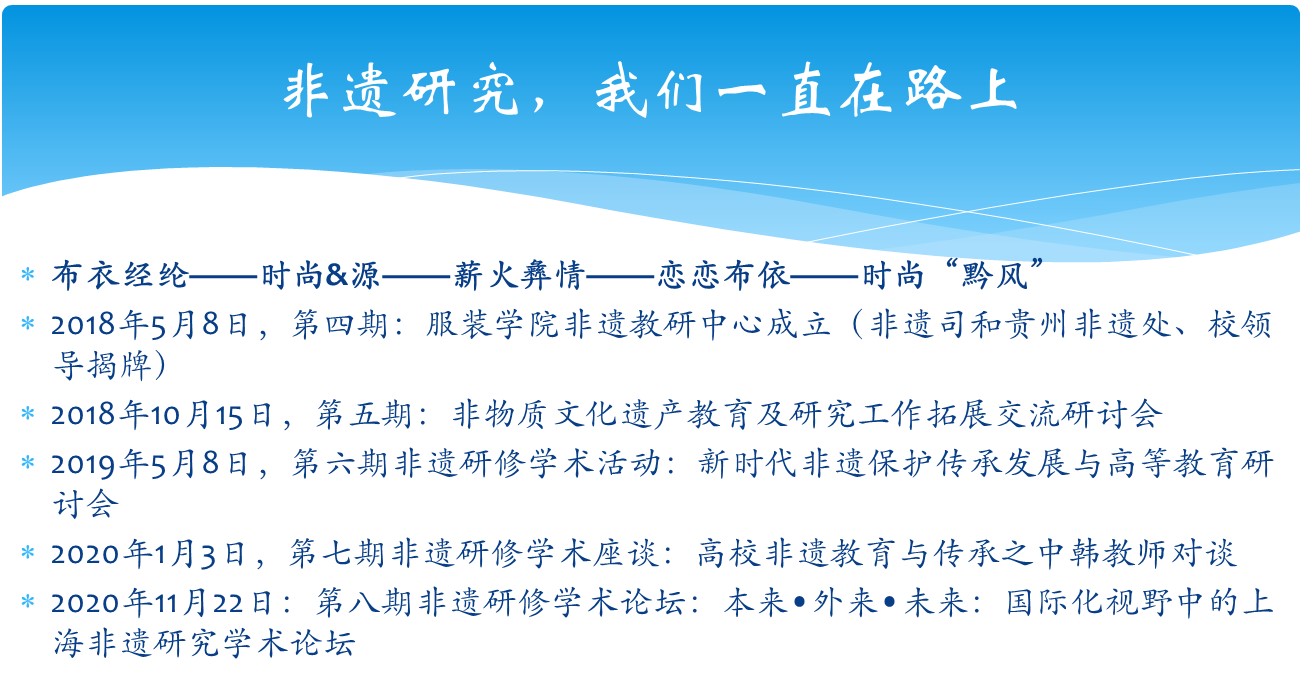 高校如何研究非遗?柯教授认为四点很重要:① 实地调研是基础;② 核心价值要提取;③ 弄懂原理是关键;④ 纸上谈兵要切忌。卓有成效的非遗研究者中,高校人员占绝大多数仅靠文献资料认识非遗是远远不够的。3000多个国家级非遗项目都是存在于特定区域的精神遗产,离不开当地的水土与区域文化特色。例如欲漫涩 余继宏老师带着他的学生多次去崇明,完成崇明土布创新设计,研究少数民族服饰的张顺爱老师去贵州调研十数次。