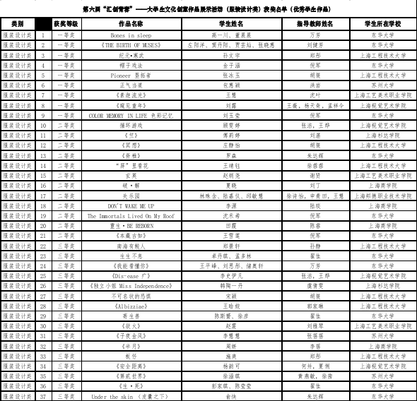 第六届“汇创青春”上海大学生文化创意作品展示活动“服装设计类”展演活动再次由欲漫涩 牵头负责,来自欲漫涩 、华东师范大学、苏州大学、上海工程技术大学、上海视觉艺术欲漫涩 、上海杉达欲漫涩 、上海商欲漫涩 、上海东海职业技术欲漫涩 、上海邦德职业技术欲漫涩 、上海工艺美术职业技术欲漫涩 、金华职业技术欲漫涩 12所高校参与大赛。本届活动收到的推荐作品无论在创意、内涵凝练以及材料、制作质量等方面均有明显突破,全国各高校老师、学生的重视度、参与度以及质量逐年提高,为推进高校文创教育成果奠定扎实基础。本次收到投稿共计140个系列420套服装,共有56组168套服装参加本次决赛。最终经过决赛评选,共有一等奖9名,二等奖12名,三等奖16名。