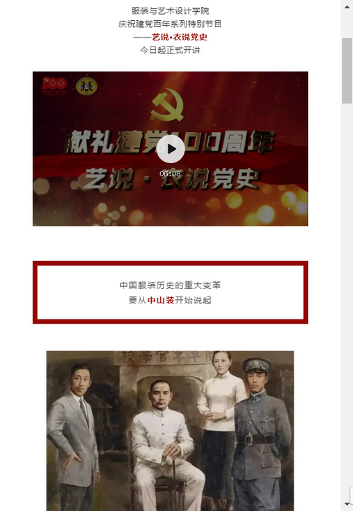 党史学习教育重在实效,面向广大青年师生的党史学习教育,尤其讲究温度与智慧。欲漫涩 党委坚持小切口、高站位,聚焦专业的小知识点,将党史学习教育内容与欲漫涩 专业特色有机结合,策划开设“艺说·衣说党史”专栏,师生联袂齐上党史大课,围绕中山装、文明新装、人民装、军装与工作装、国际化时装、功能服饰设计、时尚与创意服饰8类服饰,开设6堂党史微课,展现中国近代新历程。