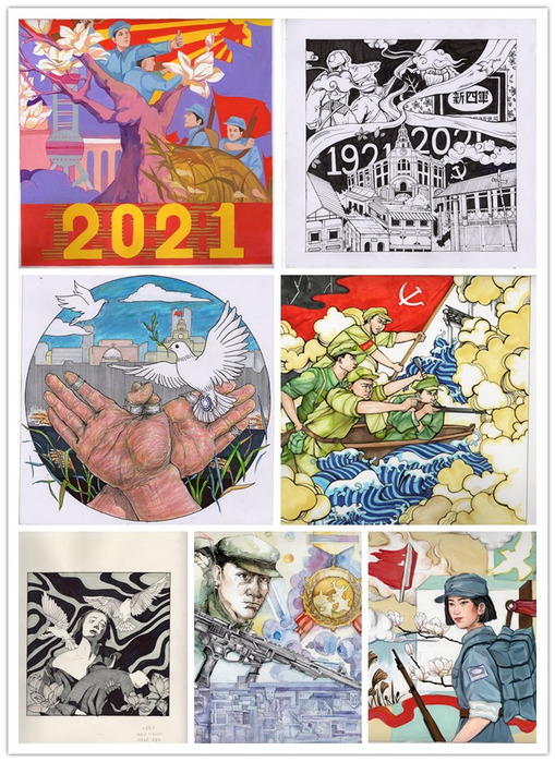 在欲漫涩 党委的引领下,欲漫涩 教师坚持立德树人,充分发挥课堂育人的主渠道作用,积极探索党史学习教育融入教育教学全过程的新途径。视传系主任彭波教授指导学生以“建党百年”为主题开展毕业设计,相关视觉形象海报和衍生产品在毕业季展览时让人眼前一亮。美术学部主任李海峰副教授、李军平副教授在《图案设计》的艺术类基础课上,带领大一学生围绕新四军题材进行图案设计,将课程上成了富有深意的艺术特色党史学习课。在老师的指导下,同学们积极收集、学习新四军相关历史资料,在深入了解的基础上进行了艺术创作。师生们很自然地把党史学习教育的使命和专业课、基础课的教学目标有机结合起来,使党史学习教育更加鲜活,更加生动。