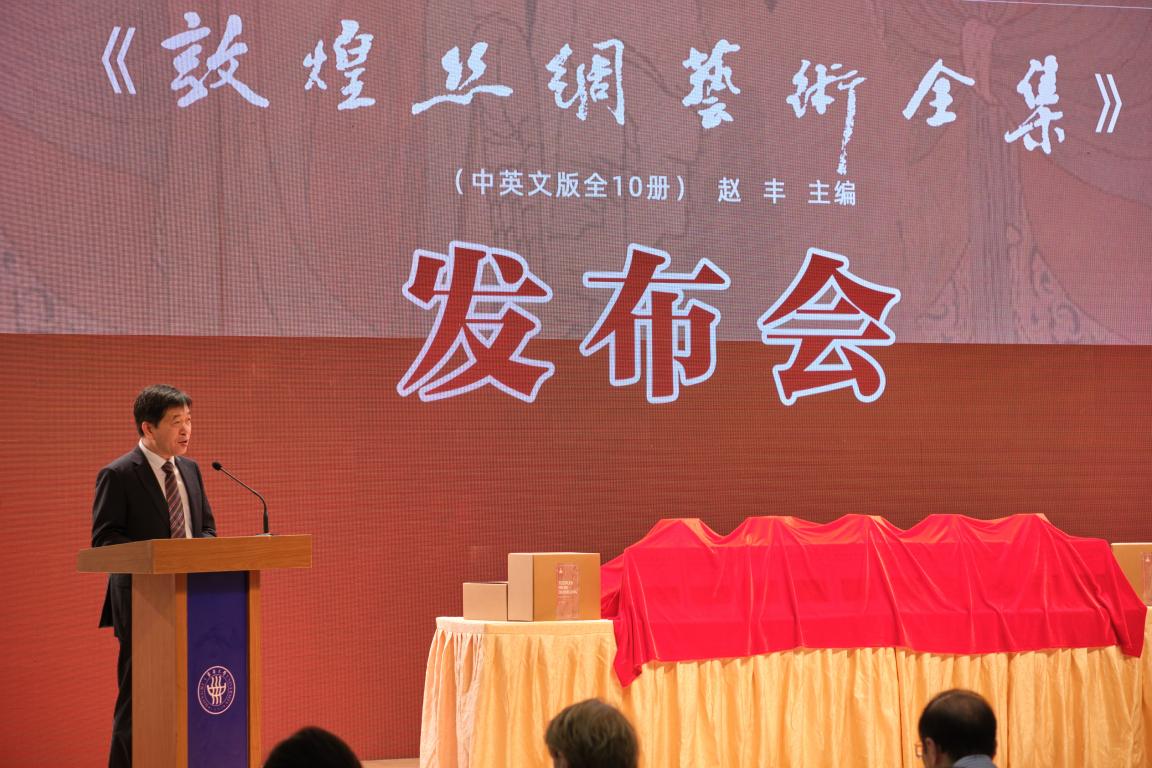 全集总主编赵丰作为作者团队代表发言,详细梳理了自2006年受邀对大英博物馆藏斯坦因纺织品进行研究,进而开始了对散藏在世界各收藏机构的敦煌丝织品的研究全过程,也提到了在成书过程中的各种困难,表达了对不能穷尽散落在世界各地的所有敦煌丝绸实物的遗憾。最后赵丰教授对团队重要的参与成员一一进行了介绍和感谢,并表达了对敦煌丝绸继续深入研究的愿景。