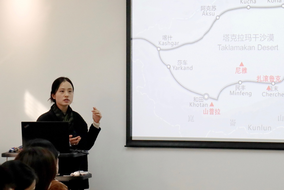 王乐教授的研究聚焦于中国古代丝绸纹样,她作了主题为“从古典到新样——汉唐之间的中国丝绸纹样”的讲座。她指出战国秦汉是丝绸之路开拓过程中的重要年代,至唐代达到鼎盛时期。汉代前后,养蚕和丝织技艺沿着丝绸之路由内地传往西方,东西方丝绸艺术开始相互影响,相互交流。秦汉统治者都十分热衷于源于道家的神仙学说,在丝绸艺术作品中的具体表现则是大量的云纹。中国传统的云气动物纹样到魏晋时已僵化并衰退,西方艺术开始影响中国内地的丝绸图案,继之而起的是模拟西域风格的各种骨架排列,其中以环式联珠团窠最具代表性。唐代,东西方设计艺术兼容并蓄,出现了陵阳公样,同时一种以花卉植物纹样为主题的团窠宝花纹亦开始兴起,并向折枝、缠枝花鸟纹演变,最终形成大唐新样。
