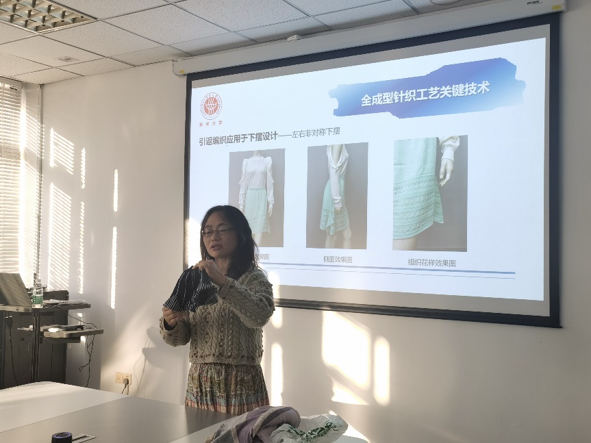 王建萍教授做了主题为“无缝针织工艺技术的创新探究与挑战”的讲座。她首先通过小视频全面介绍了全成型针织工艺技术的基本原理和操作方法,使现场师生对全成型针织工艺技术建立了生动形象的认知。然后基于市场需求和无缝针织特性,从无缝针织服装定义出发,详细介绍了世界前沿无缝针织服装现状,并以裙装设计案例为切入点,分享了全成型针织工艺技术的创新与挑战。在讲解的过程中,王建萍教授还分享了由团队成员设计完成的多件全成型针织服装样品,引发了现场师生的热烈讨论,进一步加深了对全成型针织工艺技术的理解。