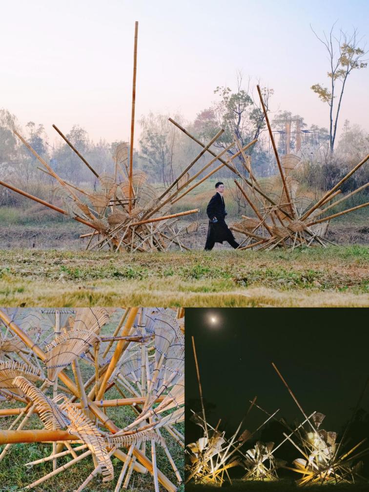 作品二:《蝴蝶效应》,设计师基于对“城市意向”的思考,“蝴蝶效应”折射着一种混沌现象,任何事物发展都存在其定数和变数,回味从城市到乡村的一次抽离,运用乡村材料“竹耙”为创作材料,搭配2-5米的竹竿,将城市的繁华以空间转译的手法投射到乡野的水岸边。夸张的装置形同快乐、野趣生长的芦苇。可预见的形态规律和不可测的生长轨迹矛盾且统一。