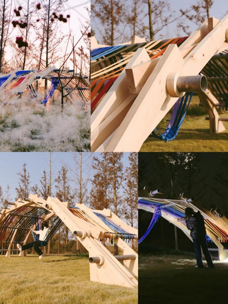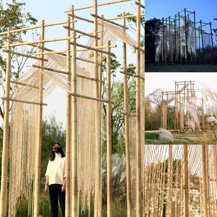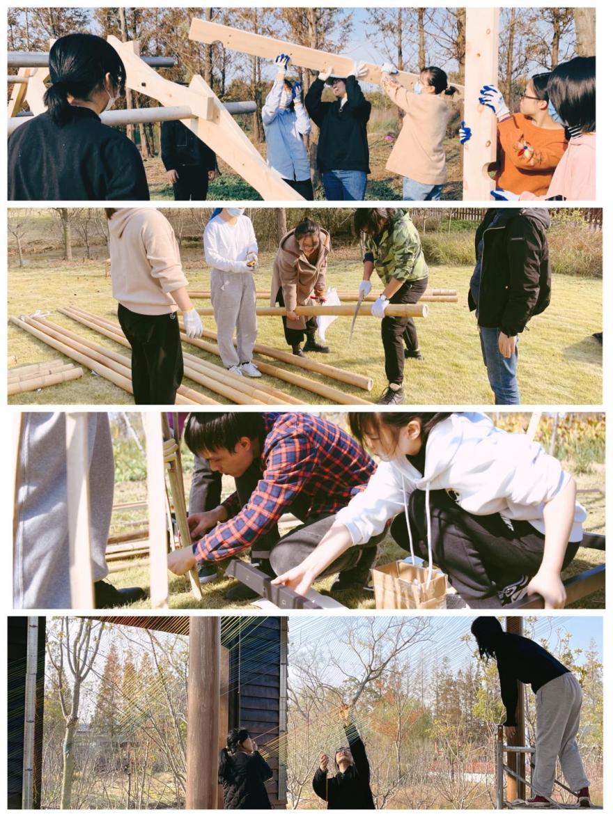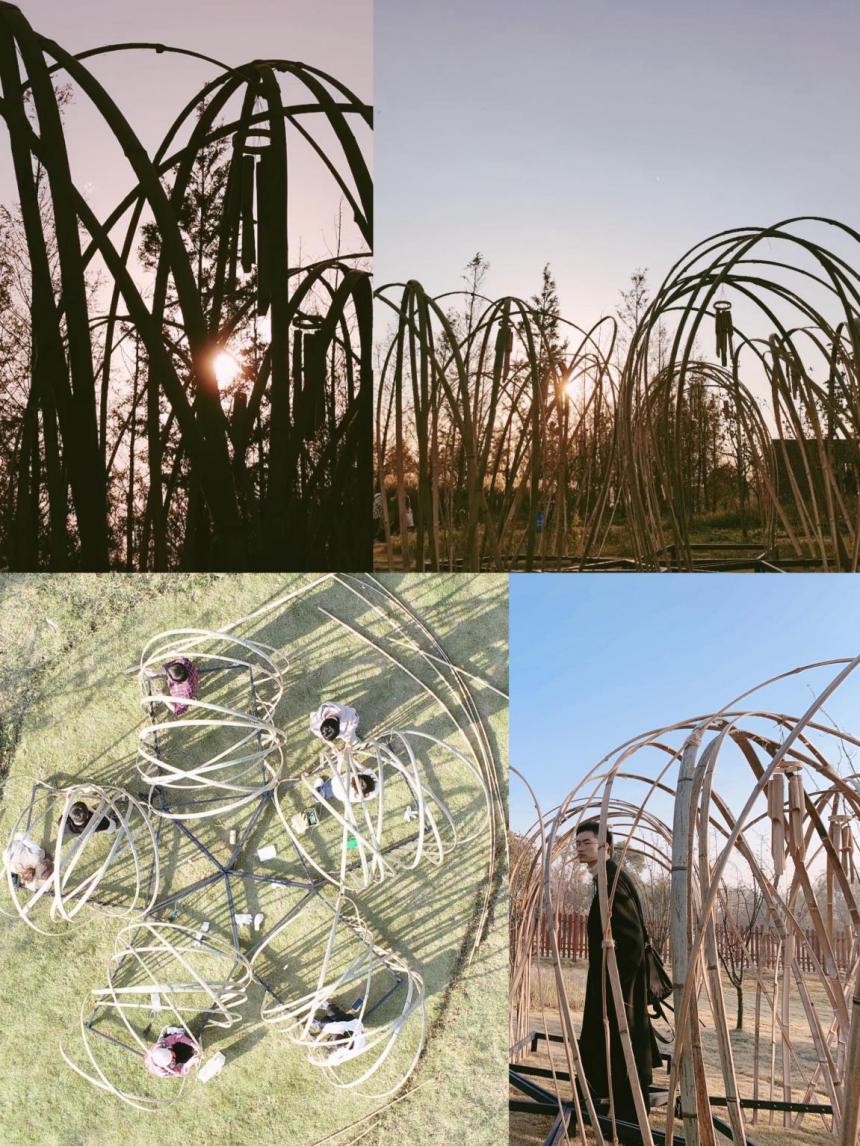 艺术搭建作品在崇明岛海棠湾最终落地呈现,学生们以竹、木、线等自然材料,通过提前预制加工与定制配件,以小组共同协作的方式,在2天时间内徒手合作搭建完成。亲历了设计从概念到现实落地的整个复杂过程,也感受到了亲自动手搭建的困难,最终作品伴着乡村的晨雾完美的呈现。