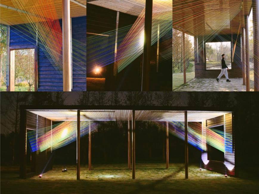 作品三:《棠丝》,在场地一处亭内,将线性结构引入空间内部,彩色的尼龙线交错编织,宛若乡村中雨后的彩虹,架在阳光之下,人影穿梭其间,色彩若隐若现,共同构成一幅闲适的自然之景。