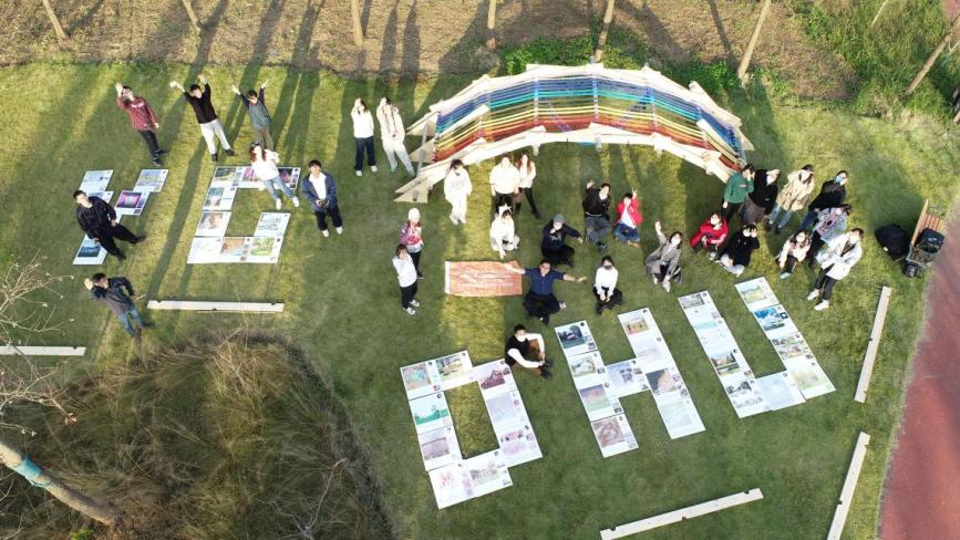 构国际设计顾问为该课程的共建方,企业团队为课程提供了专家指导、实训场地与物料资金的支持。由环境设计系黄更副教授带领46名本、硕、博学生参与了课程实施,从第一次的田野调查到项目现场搭建落地,前后共经历了7个月。期间学生们共完成了46件详细设计方案,通过指导小组最终评审,通过适宜尺度、在地材料、可预制性、乡野趣味性等条件,最终确定了5件现场搭建作品。