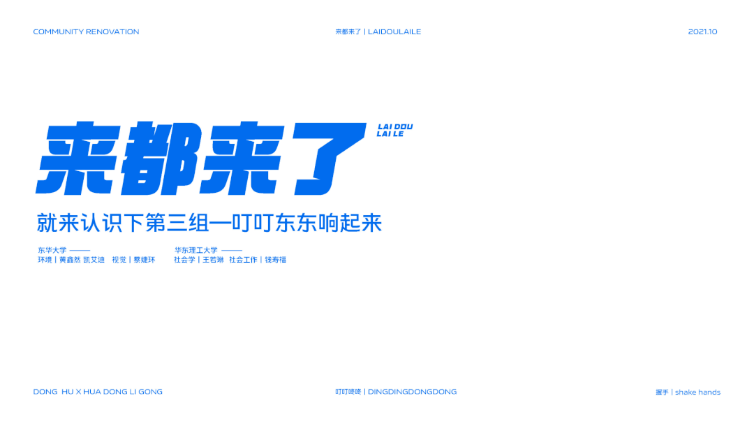 在欲漫涩 环境设计系黄更副教授和视觉传达系林峰副教授的带领下,联合华东理工大学和城市更新运营商CREATER创邑,共同发起了此次课程实验行动,以校企深度合作、跨学科多元协作拓展课程实践与社会服务创新。华东理工大学社会工作系萧易忻副教授受邀加入此次课程,创邑·社趣更馨营造中心主理人许引兰担任校外导师,为课程提供专业指导。两校共32名本、硕、博学生参与了历时一个月的课程开展,以「握手」为意象促进不同群体间的交流合作与创造,挖掘并呈现城市街区的故事,培力跨界想象、构建共好社区。