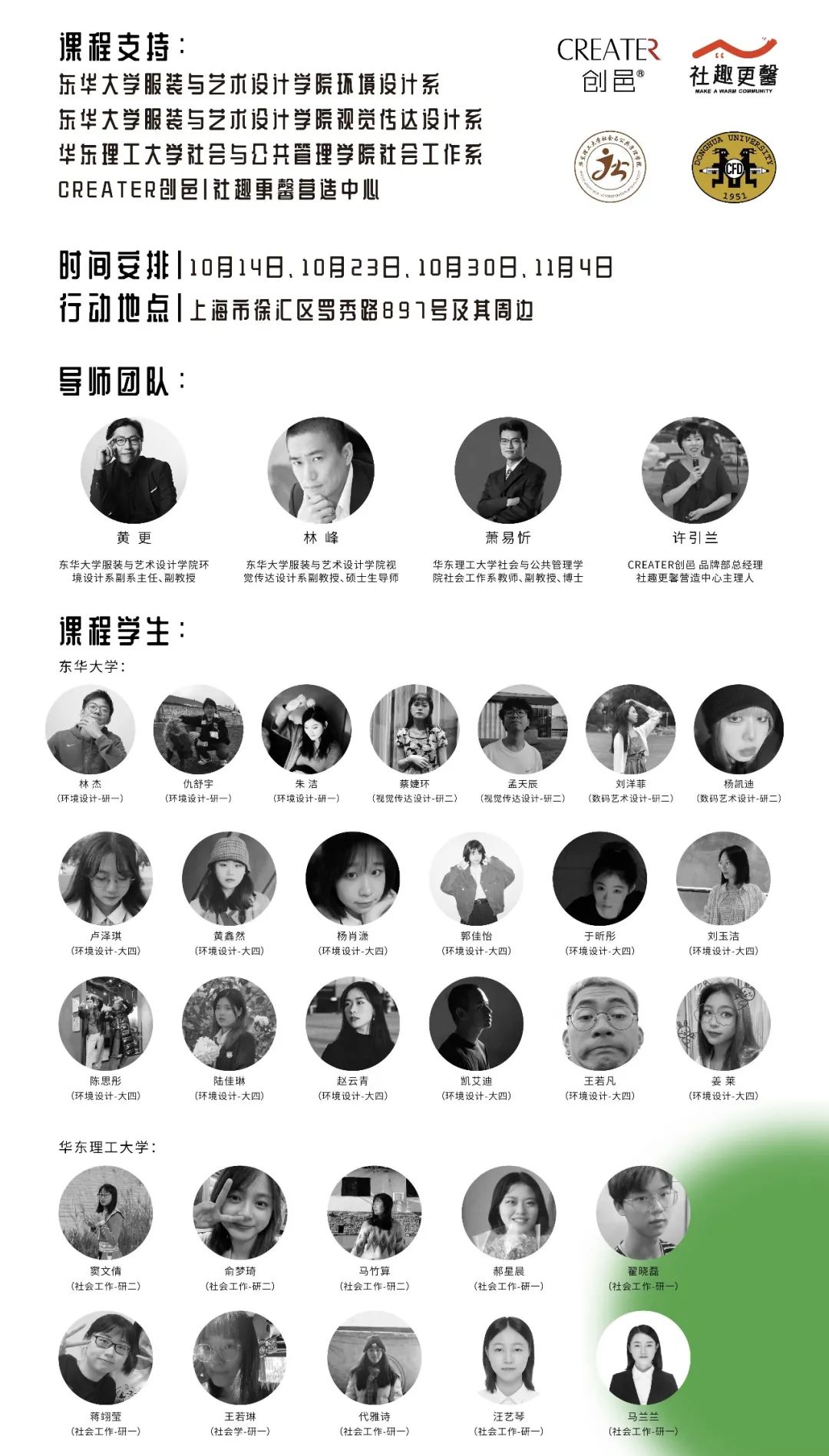 在城市更新进程中,我们不断关注到空间改善与人文提升并举的重要性。本次跨学科课程实验行动将设计系与社工系共融于社区营造,倡导设计环境的同时关注社会领域、联结关系的同时发散设计想象,在双学科互相促进的过程中帮助学子更了解环境设计和社区营造的践行过程。CREATER创邑作为城市更新运营商及课程共建方,也希望联合高校、学习高校智库前沿知识,并为广大学子提供实践创造平台。