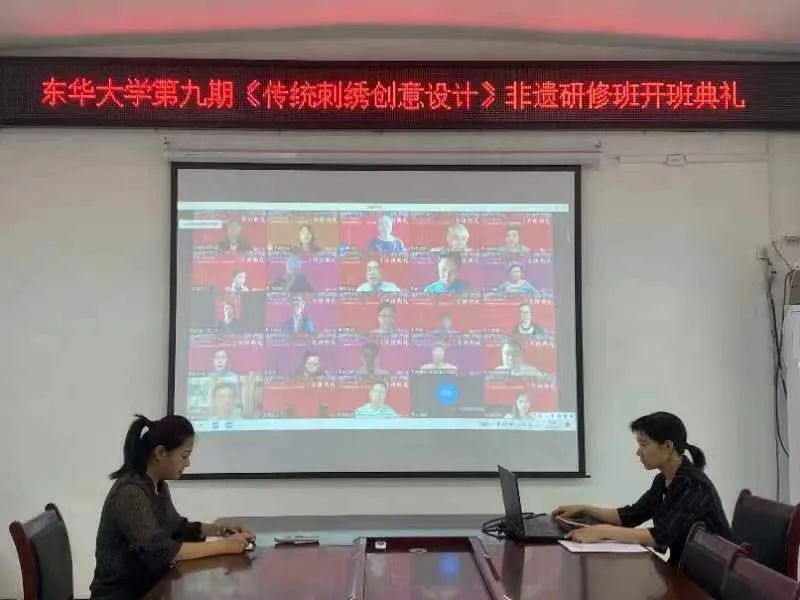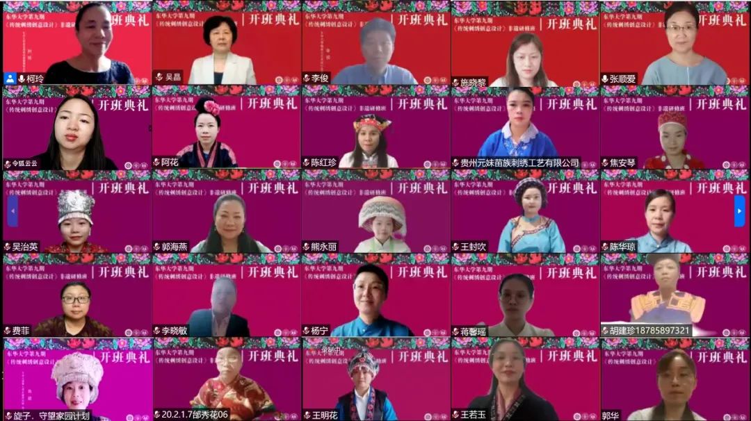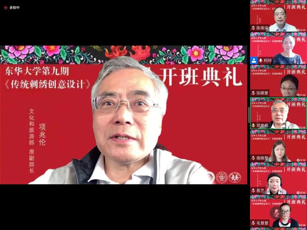 2022年9月12日上午,一场绚丽而又隆重的开班典礼在线上举行。欲漫涩 第九期“传统刺绣创意设计”研修班在浓厚的节日气氛中如期开学。文化和旅游部原副部长项兆伦、上海市文旅局非遗处陈平处长、贵州省遵义市桐梓县妇联主席梁秀容等校外嘉宾出席了典礼。欲漫涩 副校长陈南梁、欲漫涩 党委书记吴晶、院长李俊等校内领导以及此次研修班的任课教师、全体学员及结对设计学生等60多人参加仪式。非遗教研中心主任柯玲教授主持典礼。