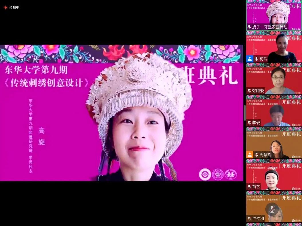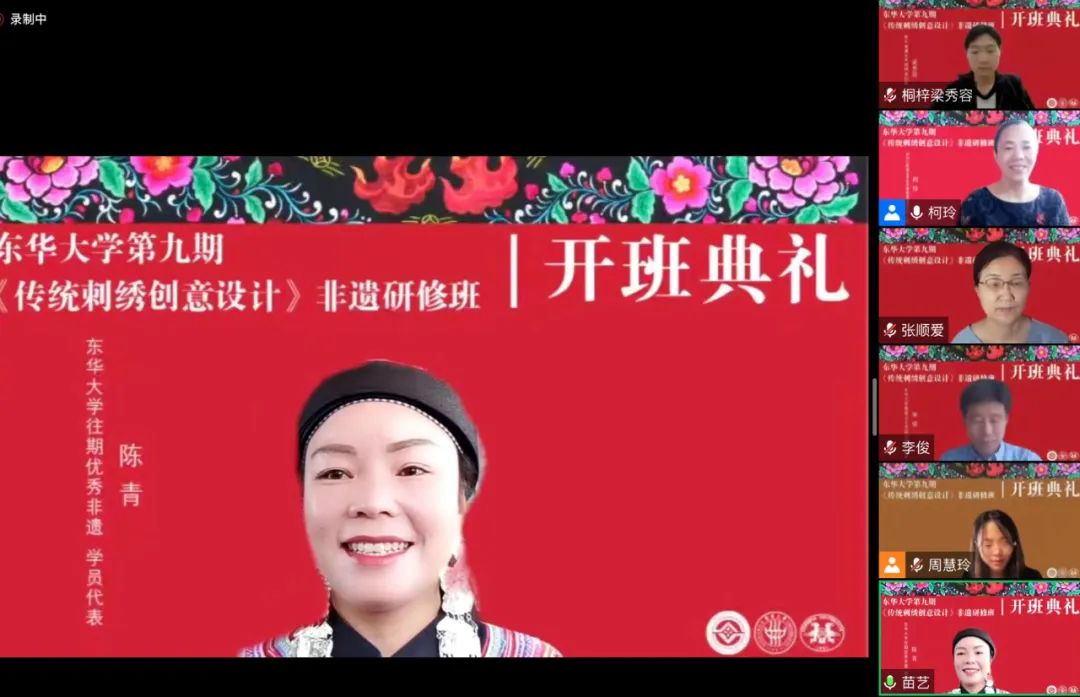 第九期非遗研修班是2021年文化和旅游部下达给欲漫涩 的研培任务。受疫情影响,延期至今年拟通过线上线下集合的方式完成此次研修。本期典礼上,首次增设往期优秀学员代表发言环节,东华非遗研培一期学员、八期的班长陈青应邀参加典礼。她兴高采烈地回忆了研修时东华老师给她提供的无私帮助,字里行间都流露出对于东华的真诚感激。她充满激情地说:“利用在东华学习到的知识,我的事业由旅游产品、服饰开发、生产延伸到了非遗体验和民宿经营,这离不开党委、政府的决策和欲漫涩 这个学习平台。”