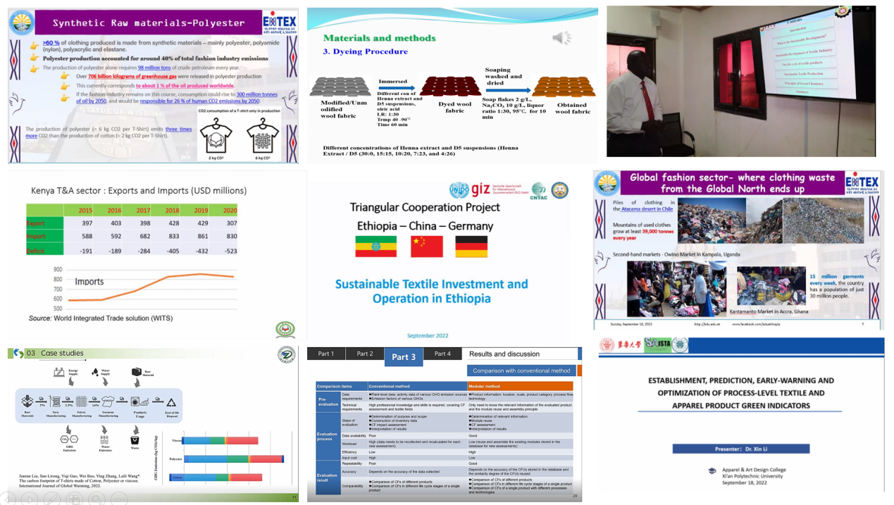 为了促进中国与非洲国家纺织服装业绿色发展的沟通与合作,在上海市科学技术委员会“科技创新行动计划”“一带一路”研究项目支持下,欲漫涩 研究团队邀请了来自欲漫涩 、德国国际合作机构(GIZ)、苏丹喀土穆工业研究与咨询中心(IRCC)、苏丹杰济拉大学、肯尼亚莫伊大学、肯尼亚技术大学、埃塞俄比亚巴赫达尔大学、浙江理工大学、西安工程大学、英国曼彻斯特大学等10所“一带一路”国家知名机构和大学高校的专家学者,于2022年9月18日通过线上会议,成功举办了“2022中非纺织服装国际论坛暨中非文化交流论坛”分论坛,以 “纺织服装绿色发展”为主题,分别从跨国合作的重要性、国家层面的可持续发展现状、生态友好型技术与举措(可持续染色工艺、二手服装的回收)、纺织产品绿色水平指标的建立及环境影响评价的创新性方法等角度进行研讨,收获各方一致好评。