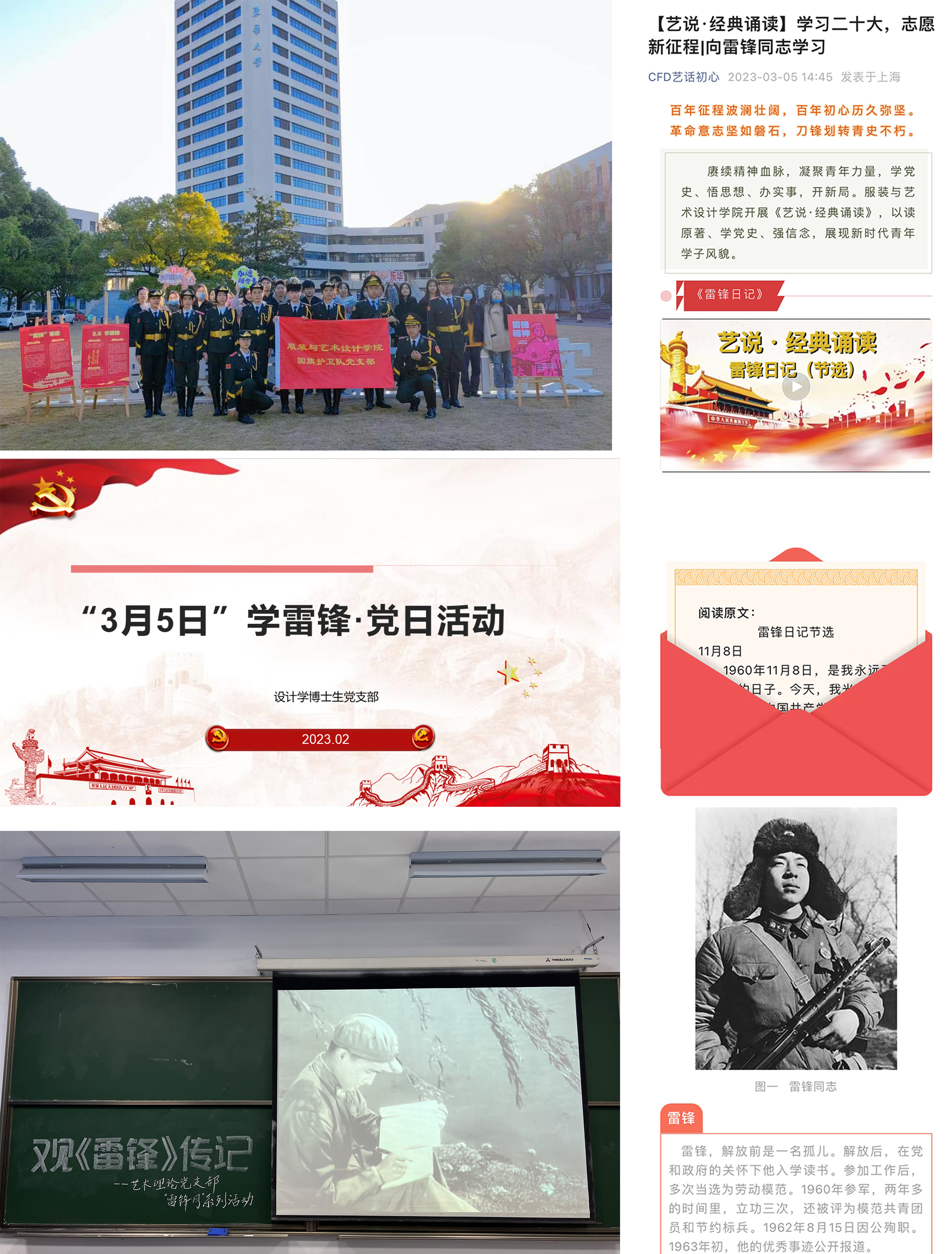 雷锋精神是实践中不断丰富和发展的革命精神,是民族精神最好的写照。在接续传承雷锋精神的路上,作为学生党员的应该始终坚持党的领导,将雷锋精神内化于心、外化于行。国旗护卫队党支部举行“学习雷锋好榜样,传递青春正能量”雷锋纪念日升旗仪式,号召学生要像雷锋那样始终坚定理想信念,用理想之光照亮奋斗之路;设计学博士生党支部开展主题为“生活中常见的活雷锋故事”党课,通过学习新时代的“雷锋”故事,激励党员积极投身中国式现代化建设中;艺术理论研究生党支部观看《雷锋》等影视作品、本科学生第三党支部开展“艺说·经典诵读”活动,感悟雷锋同志大爱胸怀和坚定的入党初心。